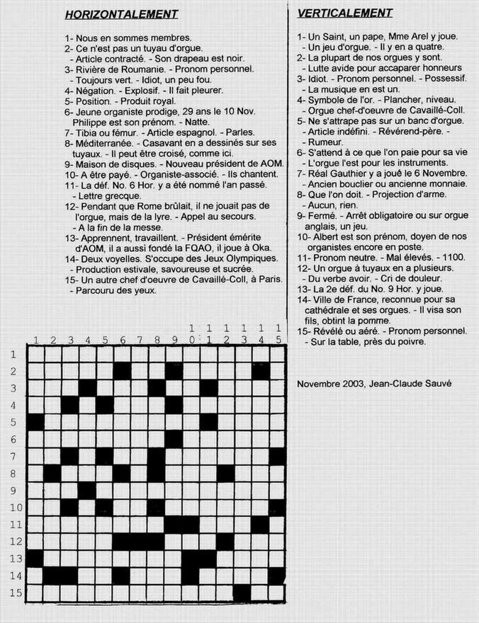 C'est le 17 juin prochain qu'aura lieu la cinquième édition du concours d'orgue de Québec. La date limite des inscriptions est le 1er mars 2004 et, parmi les conditions à remplir pour être admissible au concours, les candidats doivent être citoyens canadiens et domiciliés au Québec depuis au moins deux ans à la date limite de l'inscription, et être nés après le 1er juillet 1968. Les renseignements sont disponibles à l'adresse postale suivante : ou sur le net à l'adresse suivante :